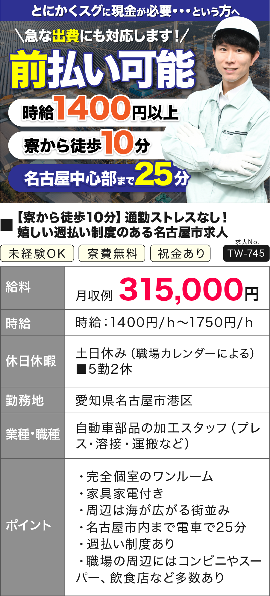 前払い・週払いなどの制度に加えて入社特典がもらえる所もございます。