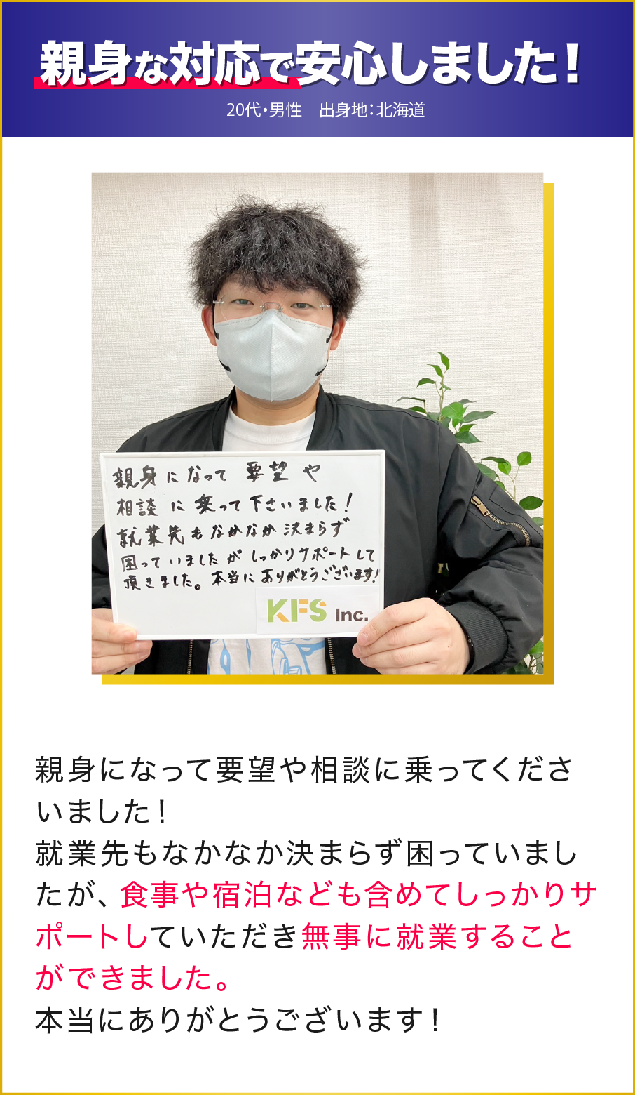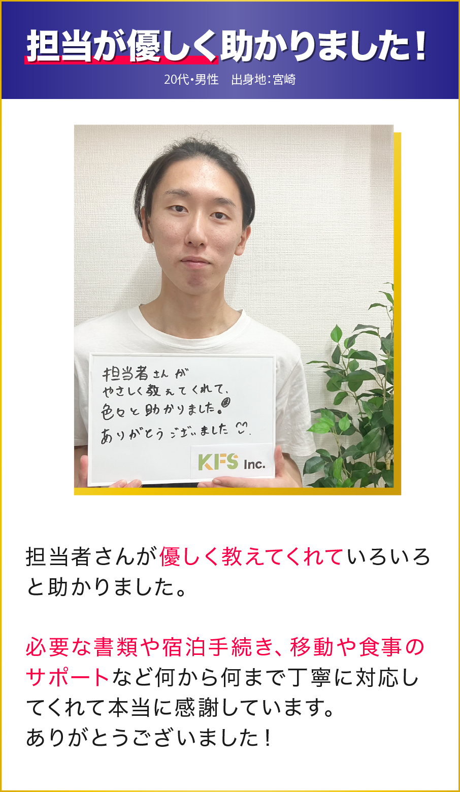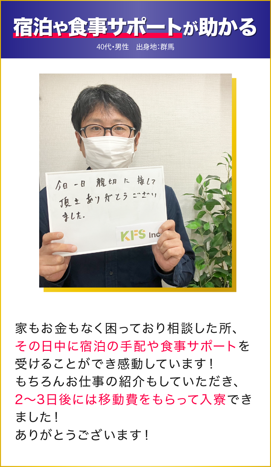 また、寮に入るまでのホテル宿泊や待機寮の準備、移動にかかる費用など、お金がなくても宿を手配するので、その日の